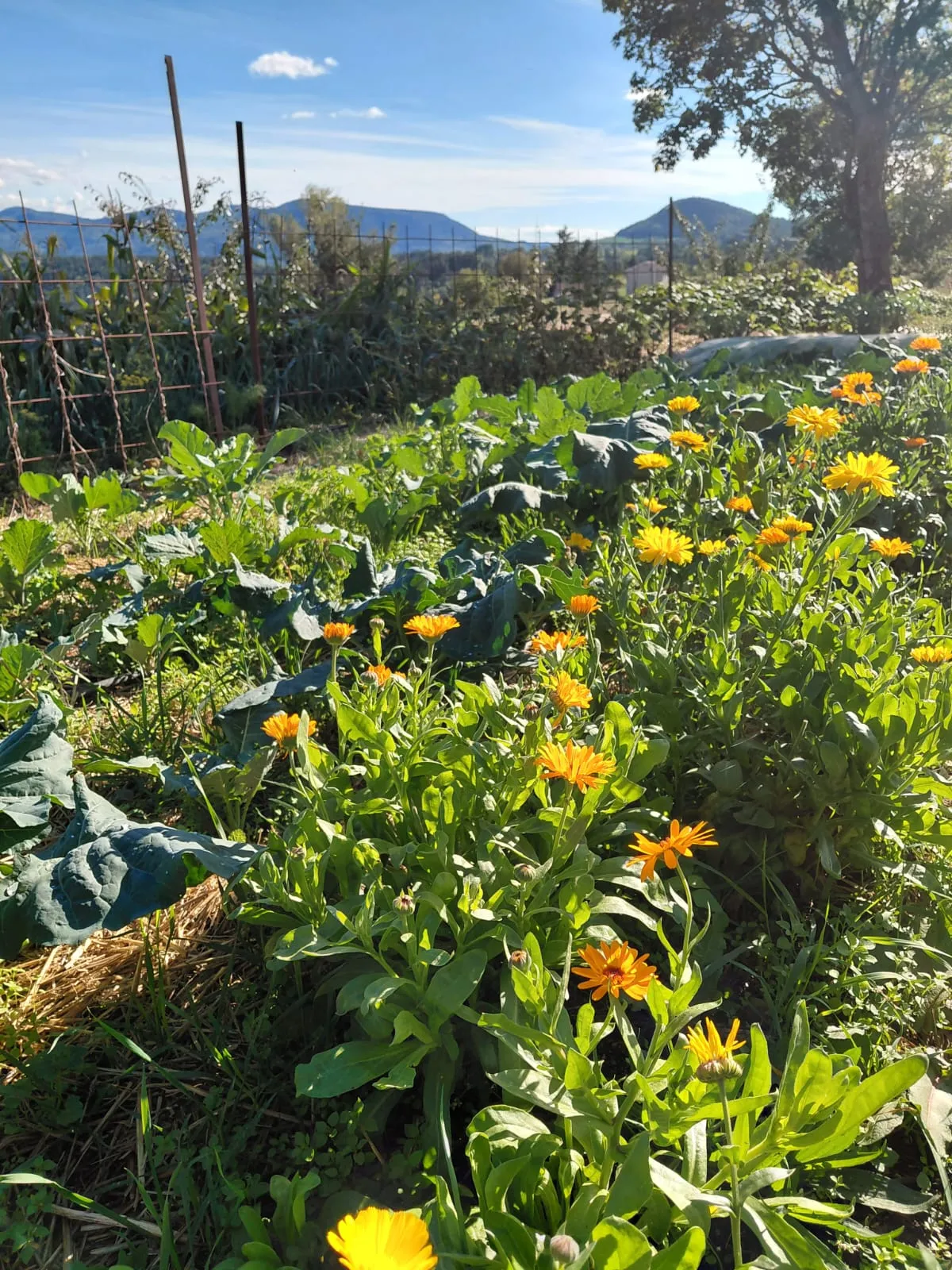 La nature, cette terre faite de rochers, d’arbres et de genêts, que nous avons patiemment travaillée pour la rendre cultivable, se couvre aujourd’hui de fleurs au service de vos papilles. Abeilles, papillons et pollinisateurs s’y plaisent.